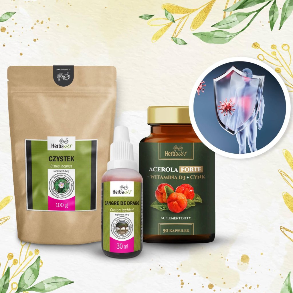 Ten pakiet pomoże ci wzmocnić naturalną odporność. Zawiera idealne połączenie trzech sprawdzonych produktów ziołowych: mianowicie krople Sangre de Drago, kapsułki Acerola FORTE wzbogacone witaminą D3 i cynkiem oraz herbatę Czystku. Zestaw został stworzony w współpracy z renomowanym doktorem Marcelem Paszanda. Produkty wzmacniają odporność na kilka sposobów. Oczyszczają organizm z drobnoustrojów, dostarczają dużą ilość niezbędnej witaminy C i działają przeciwwirusowo. Pakiet pomaga w utrzymaniu dobrego stanu zdrowia, nawet jeśli jesteśmy narażeni na większą wiremię, nadmierne obciążenie pracą, trudne warunki pogodowe czy stres.